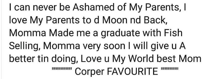 "I can never be ashamed of my parents, I love my parents to the moon and back, momma made me a graduate with fish selling. Momma very soon I will give you a better thing doing. Love you my best mother" she said.